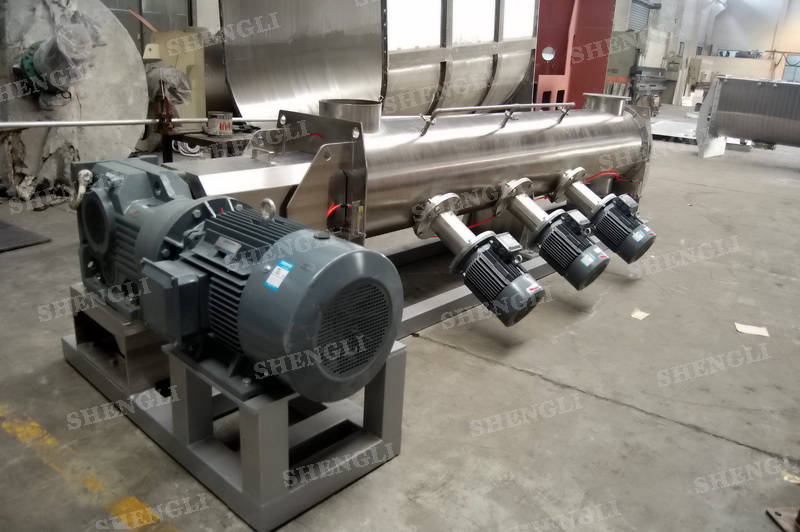 描述:?jiǎn)屋S連續(xù)式攪拌機(jī)臥式安裝,進(jìn)行連續(xù)式生產(chǎn)模式,推進(jìn)槳葉配合高速飛刀有效打散、混合物料。設(shè)備主軸、飛刀主軸采用氣密封,杜絕粉料泄露。設(shè)備配置液體噴頭,可霧化加液。