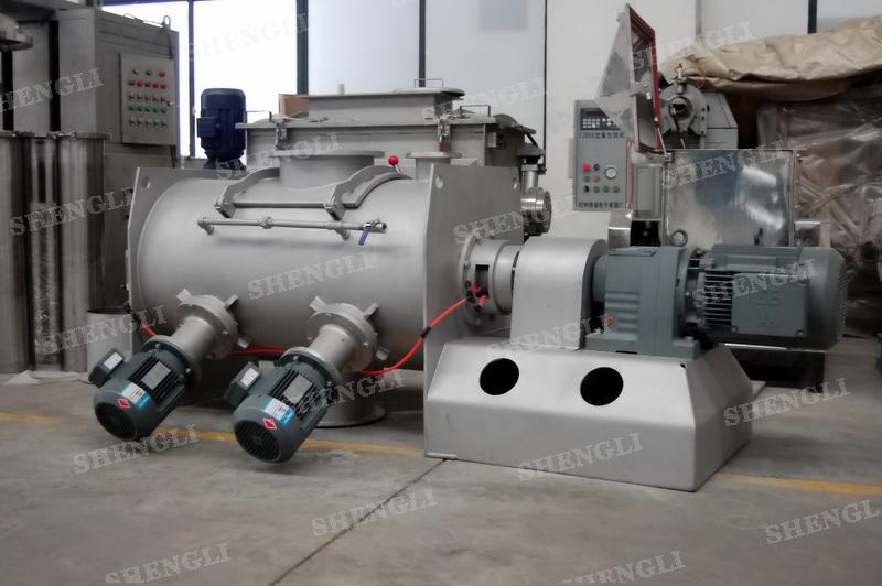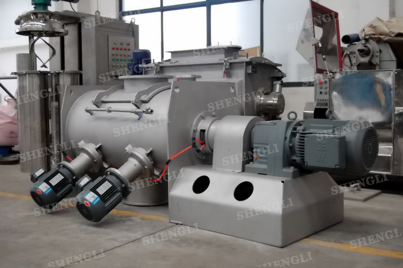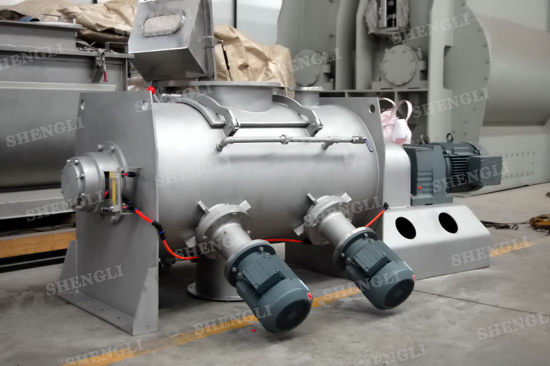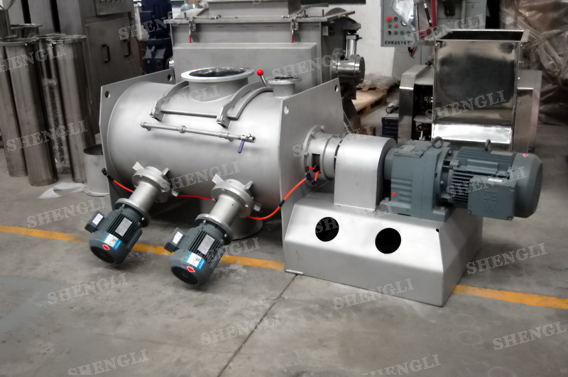 工作原理:犁刀式混合機(jī)采用臥式圓柱筒體,內(nèi)設(shè)平行主軸,主軸上安裝若干犁式刀頭,通過較快的旋轉(zhuǎn)速度,分割、重合物料,實現(xiàn)快速攪拌的功能,常結(jié)合1500-3000轉(zhuǎn)高速剪切飛刀相互作用。