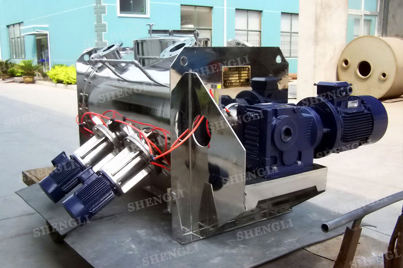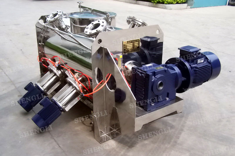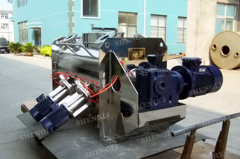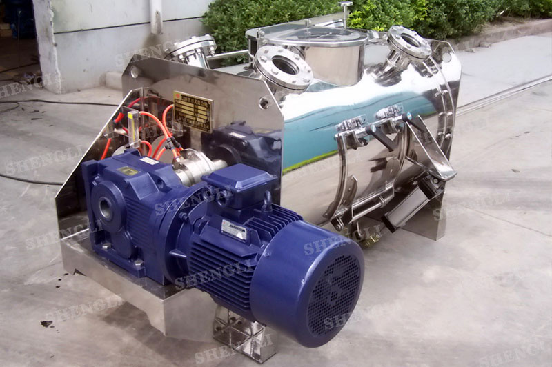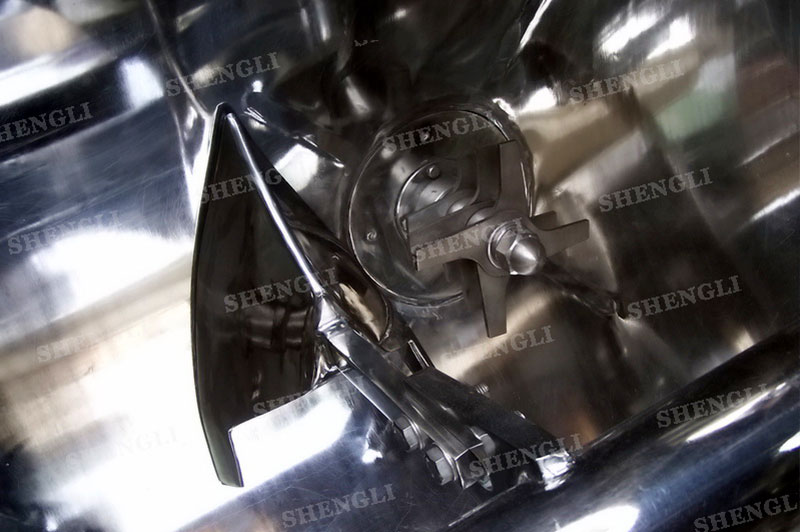 工作原理:犁刀混合機采用臥式圓柱筒體,內設平行主軸,主軸上安裝若干犁式刀頭,通過較快的旋轉速度,分割、重合物料,實現(xiàn)快速攪拌的功能,常結合1500-3000轉高速剪切飛刀相互作用。
