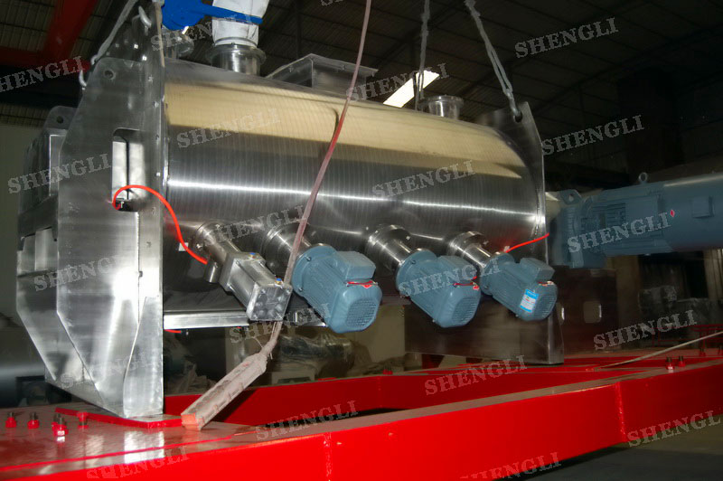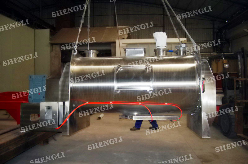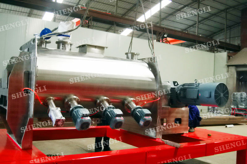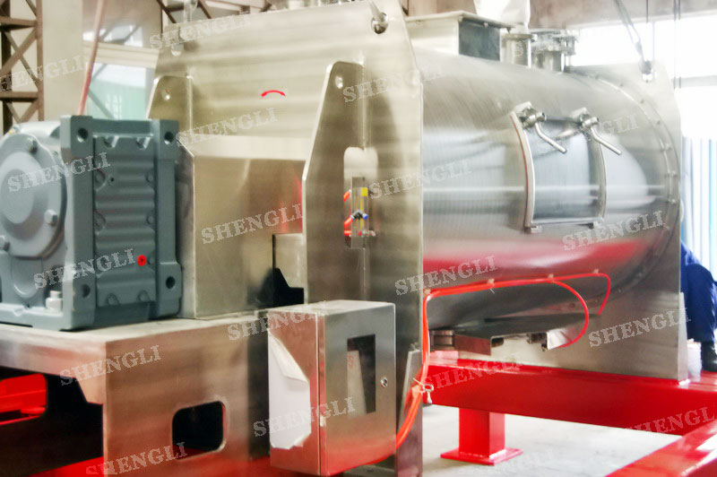 工作原理:犁刀式混料機(jī)采用臥式圓柱筒體,內(nèi)設(shè)平行主軸,主軸上安裝若干犁式刀頭,通過較快的旋轉(zhuǎn)速度,分割、重合物料,實(shí)現(xiàn)快速攪拌的功能,常結(jié)合1500-3000轉(zhuǎn)高速剪切飛刀相互作用。