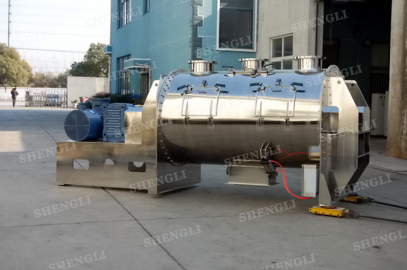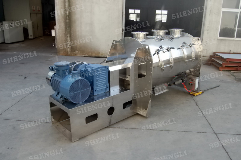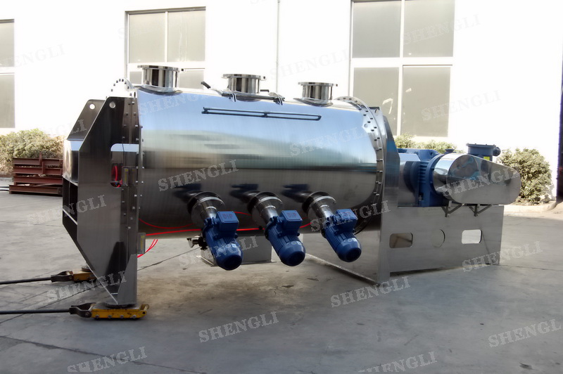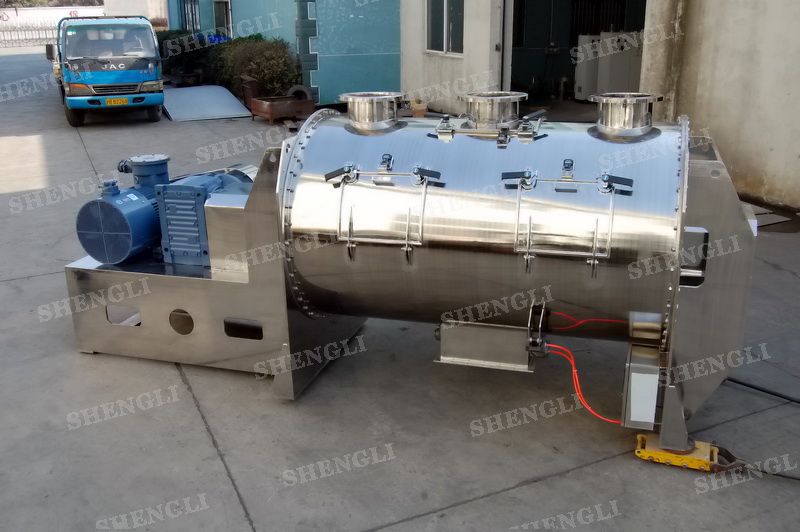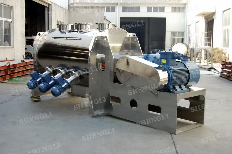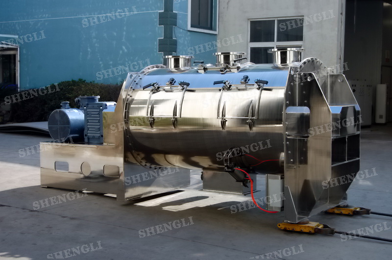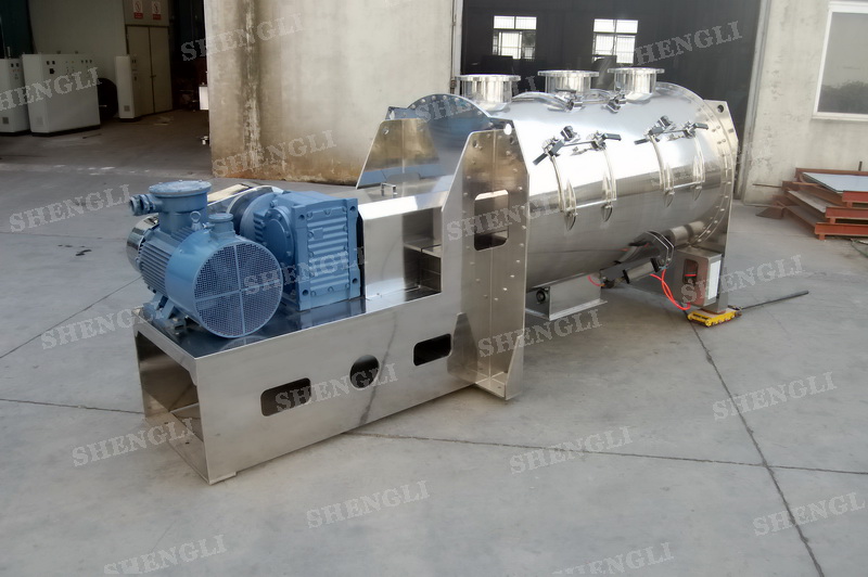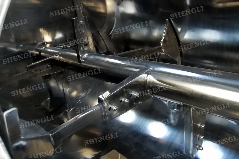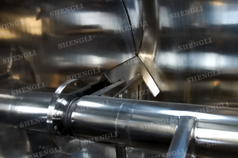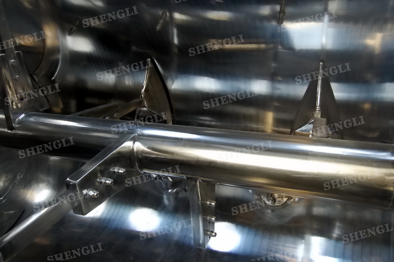 工作原理:犁刀攪拌機采用臥式圓柱筒體,內設平行主軸,主軸上安裝若干犁式刀頭,通過較快的旋轉速度,分割、重合物料,實現(xiàn)快速攪拌的功能,常結合1500-3000轉高速剪切飛刀相互作用。
