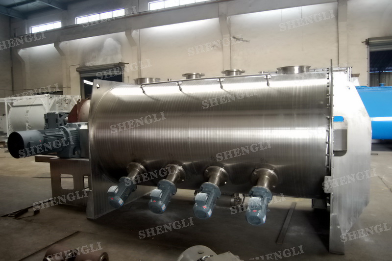 工作原理:犁刀混合機(jī)采用臥式圓柱筒體,內(nèi)設(shè)平行主軸,主軸上安裝若干犁式刀頭,通過(guò)較快的旋轉(zhuǎn)速度,分割、重合物料,實(shí)現(xiàn)快速攪拌的功能,常結(jié)合1500-3000轉(zhuǎn)高速剪切飛刀相互作用。