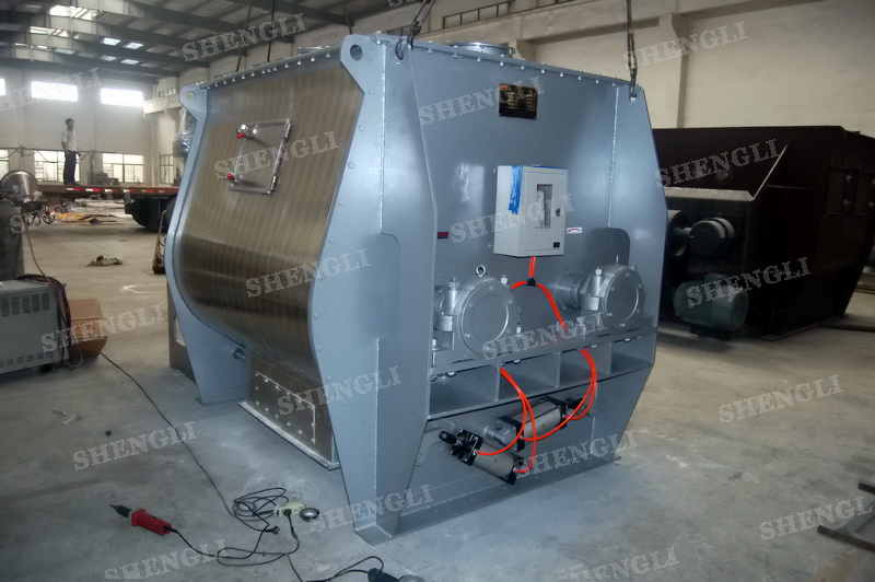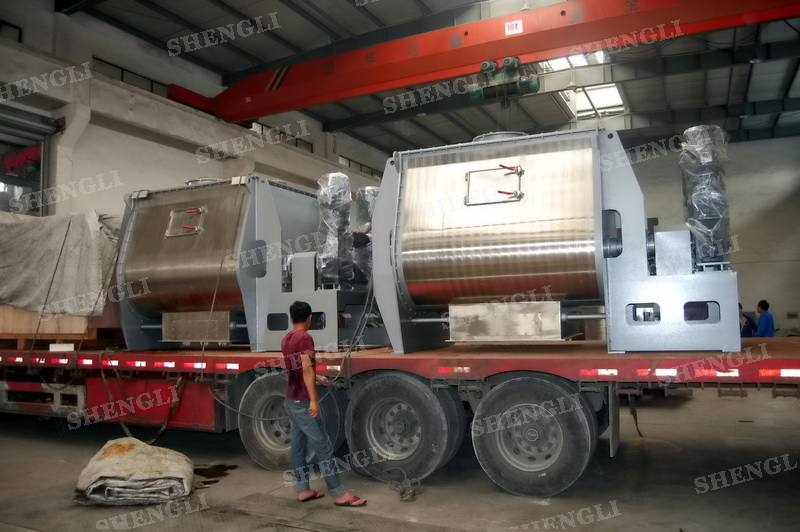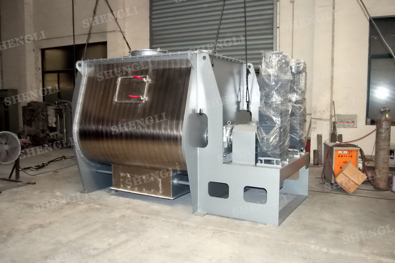 工作原理:臥式干粉攪拌機采用雙U型筒體,內(nèi)裝平行的雙主軸,主軸設有對稱的多組槳葉,其雙軸的運行軌跡部分重合形成嚙合空間,雙軸在受雙電機同步驅(qū)動,同步的對稱向外翻攪物料,致使物料能夠達到瞬間失重點,該設備具備高效物料無差別的混合能力。